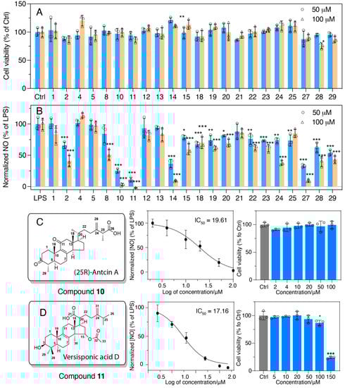 Anti-inflammatory activities of bioactive compounds isolated from Antrodia cinnamomea. (A) Cell viability of cells treated only with compounds 1-29. Dose–response curve of normalized NO with the treatment of 100 ng/mL LPS with 10. (B) Nitric oxide production of RAW 264.7 cells treated with 100 ng/mL LPS and compounds 1-29 isolated from Antrodia cinnamomea. (C) Compound 10 and (D) 11 and their cytotoxicity. Results are shown as mean ± S.D, n = 3, p* < 0.05, p** < 0.01, p*** < 0.001 vs. LPS or control.