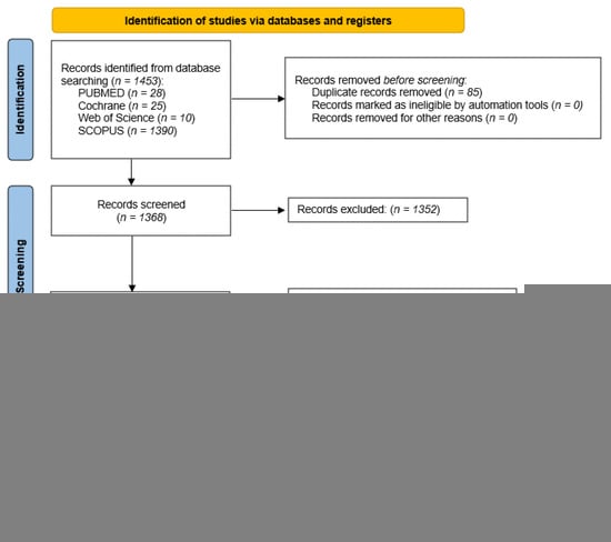A total of 1453 records were identified through database queries (Figure 1). After removing the duplicates, 1368 records remained, and a further screening led to the exclusion of 1352 publications. This substantial exclusion was based on the titles and abstracts, which upon careful review were determined to be unrelated to the specific objective of this review. For the evaluation, 16 studies were selected, from which 7 were excluded. Three of the identified studies were excluded because they did not combine HS extract with other plant extracts [,,], and another three were excluded due to the lack of a control group [,,]. One of them [] was excluded as duplicate, and the other one [] because it was an abstract. A total of seven studies [,,,,,,] were finally included in this systematic review and meta-analysis.