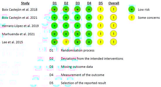 The evaluation of all of the included studies revealed that the overall risk of bias was uncertain. A notably persistent issue arose in domain 5, ‘selection of the reported result’, where ‘some concerns’ were identified in six out of the seven studies. This prevalence is not simply high, it might suggest a substantial risk of bias in this domain. The study of Lee et al. [] also exhibited “some concerns” in domain 2, “deviations from the intended interventions”. Analyzing the rest of the domains, a low risk of bias was observed (Figure 2, Figure 3 and Figure 4).