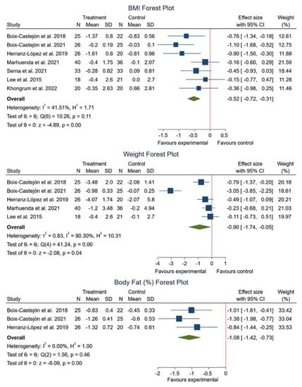 Finally, three studies assessed the impact on body fat mass percentage [,,] and a significant decrease was observed. The meta-analysis validated these findings (SMD −1.08; 95% CI: −1.42 to −0.73; I2 = 0.00%; p = 0.00) (Figure 5).