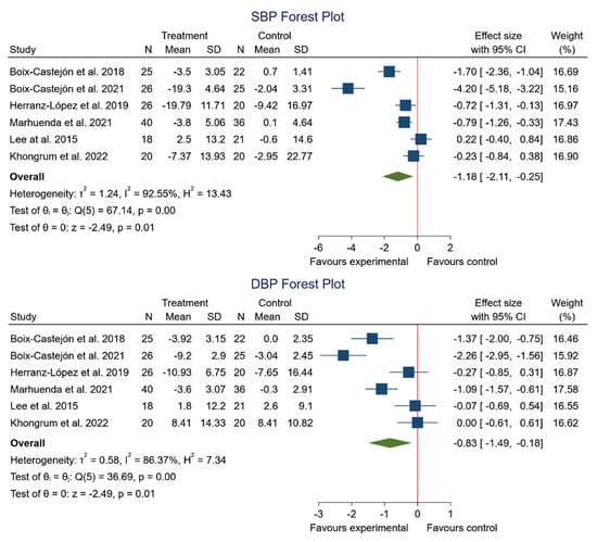 The effect on blood pressure after consumption of HS in combination with other plant extracts in comparison with the placebo intake was developed in six of the seven articles included in this systematic review [,,,,,]. In five of the studies [,,,,], it was observed that the participants experienced a decrease in the blood pressure measurement after consumption of the plant extract. Furthermore, this meta-analysis shows a significant decrease in SBP (SMD −1.18; 95% CI: −2.11 to −0.25; I2 = 92.55%; p = 0.01) and DBP (SMD −0.83; 95% CI: −1.49 to −0.18; I2 = 86.37%; p = 0.01). The data are represented in Figure 6.