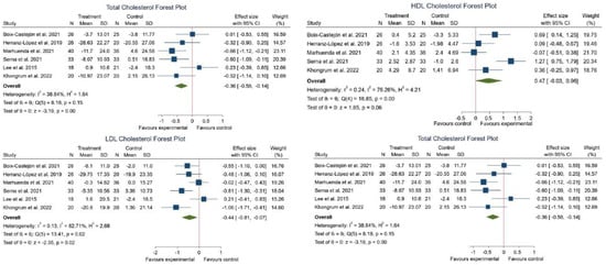 Forest plot comparisons of effects of HS in combination with other plant extracts versus a placebo on lipid profile [,,,,,].