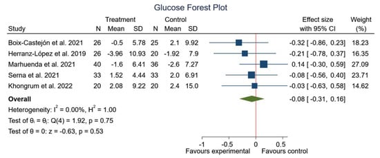 Statistically significant results were not obtained in any of the studies consulted for the evaluation of the effects of HS in combination with other plant extracts on blood glucose [,,,,]. Therefore, the meta-analysis shows no significant changes to the glycemic level from before to after the extract intake (SMD −0.08; 95% CI: −0.31 to 0.16; I2 = 0%; p = 0.53) (Figure 8).