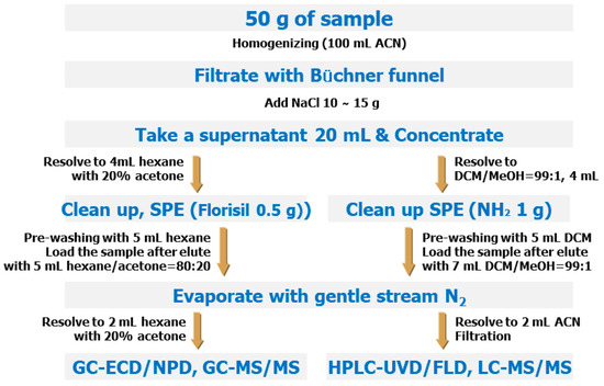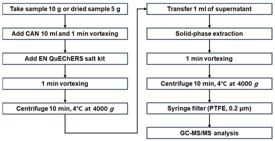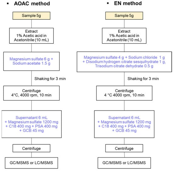 In the field of multi-pesticide residue analysis, gas chromatography-mass spectrometry (GC-MS) and liquid chromatography (LC) techniques are acceptable. Especially, GC-MS or GC-tandem MS (GC-MS/MS) offers high sensitivity and selectivity, a broad analytical spectrum, quantitative accuracy, exceptional resolution, and fast measurement speed, as well as high-quality identification of various substances. However, a highly suitable sample preparation approach such as quick, easy, cheap, effective, rugged, and safe (QuEChERS) has been recognized and is required before instrumental analysis [,,]. In contrast to the long extraction times required when using organic solvents to extract pesticides from different samples, the analysis time and processing steps are minimized in QuEChERS, which still exhibits high recoveries of 60–120% for various nonpolar and polar pesticides [,,]. Since its adoption as an Association of Official Analytical Chemists (AOAC) method in 2003, the recently improved QuEChERS method has been approved as an official method of analysis in a number of European countries (EN 15662 method) (Figure 1) [].