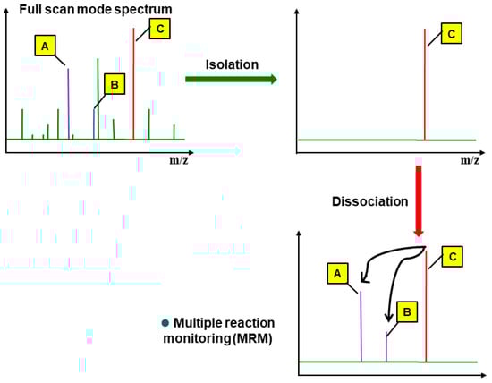 Procedure of multiple reaction monitoring (MRM). A, B, and C are representing qualitative ion 2, qualitative ion 1, and quantitative ion, respectively.