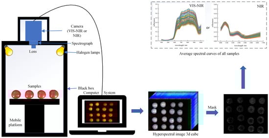 In this study, two hyperspectral imaging systems (Vis/NIR and NIR hyperspectral imaging systems) were used to photograph cherry tomato samples. Both the Vis/NIR and NIR hyperspectral imaging systems consist of four modules, including an imaging module, an illumination module, a lifting module and a software module, as shown in Figure 1. The imaging module includes the Surface Optics Corporation (SOC) 710 series camera (Surface Optics Corporation, San Diego, CA, USA). These cameras have an internal scanning mechanism to be able to scan in any direction or directly vertically downward without the need for an additional scanning stage. The Vis/NIR hyperspectral imaging system (SOC 710VP) has a spectral wavelength range of 376–1044 nm, a spectral resolution of 5 nm, and 128 bands. The NIR hyperspectral imaging system (SOC 710SWIR) has a spectral wavelength range of 915–1699 nm, spectral resolution of 2.7 nm, and 288 bands. A halogen lamp was used as the illumination module, and the power of a single halogen lamp was 50 W. A total of four halogen lamps were used. The platform module placed the subject, the imaging module allowed us to complete the capture of the subject, and the software module was used to control the acquisition of the HSI. Due to the convex surface of the samples, the uneven reflection creates a highlighted region near the vertical axial. Thus, we used ENVI5.3 (ITT, Visual Information Solutions, Boulder, CO, USA) to avoid the highlight region and to extract the reflection value for each band from the region of interest.