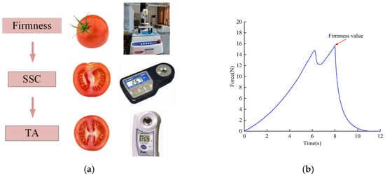 Cherry tomato is a popular respiratory leaping fruit with bright color, hard fruit, sweet and sour taste, and is rich in sugar, organic acids and other nutrients []. Its internal quality is an important basis for measuring its nutritional value. In general, cherry tomatoes are mainly evaluated by testing the soluble solid content (SSC) and titratable acidity (TA), firmness and other indicators []. Acidity and sugar affect their taste comfort and can be used for grading internal quality; changes in firmness can be used for quality monitoring during storage and transportation of cherry tomatoes and for determining the ripeness of the fruit []. Traditionally, the SSC and TA of cherry tomatoes are tested by the refractometer method, which requires the fruit to be extruded into juice and then titrated, and the firmness is tested with the fruit firmness tester. However, the above methods have a single index, are time-consuming and destructive and are difficult to be applied to the batch testing of fruits [].