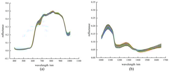 The average spectra and reflectance of cherry tomato samples in the Vis-NIR and NIR are shown in Figure 3. Figure 3a shows the reflectance spectra of 200 cherry tomato samples at 400–1004 nm. Figure 3b shows the reflectance spectra of cherry tomato samples at 1002–1652 nm. It can be seen that the variation trend of the spectral curves of cherry tomatoes with different quality parameters is similar, but the reflection intensity is different, indicating that the types of substances inside the fruits of different cherry tomatoes are similar, but the content is different. This theoretically verifies the feasibility of using hyperspectral technology to detect the internal quality parameters of cherry tomatoes.