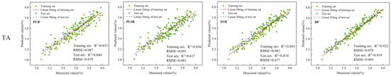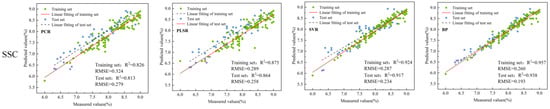 For the TA of cherry tomatoes, it can be seen from Table 2 that the prediction performance of the BP model was still better than the other three models in individual spectral bands and fusion spectral bands. The prediction performance of the BP and SVR models was still better than that of the PLSR and PCR models, and the model prediction accuracy of the PLSR was the lowest in terms of R2 and the largest in terms of root mean square error, as shown in the TA fusion spectra (Figure 7). The distance between the correction set and prediction set fitting lines of the PLSR model is relatively large, and the degree of data point dispersion is high, indicating that the PLSR model has poor prediction fitting accuracy and model stability for TA quality. The prediction performance of the fusion band spectral features is still higher than that of the individual band spectral features. Among the three bands, the prediction accuracy of the fusion band BP prediction model reaches 0.922 and the accuracy of the NIR band prediction model is relatively low, which may be due to the low correlation between the NIR band spectral features and the SSC metrics.