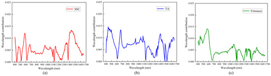 Visualization of the wavelength contribution for different qualities. (a) BP model for SSC; (b) BP model for TA; (c) SVR model for firmness.