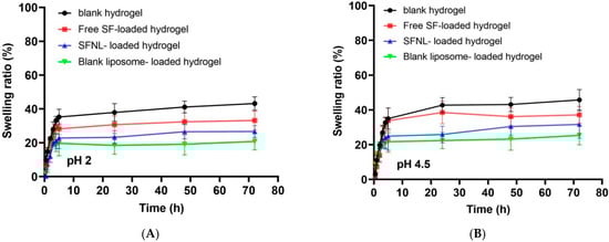 As shown in Figure 5, it is clear that the swelling percentage of PVA hydrogels after 72 h was more than 45%. As expected, the swelling ratio displayed a negative correlation with the encapsulation rate. At pH 7.4, the swelling ratios of the free SF and SFNL-loaded hydrogels reached the lowest at 43.2 and 35.8, respectively (Figure 5C). According to the results, all samples reached their maximum swelling ratios after 5 h. The polymer hydrogel without drugs had the greatest swelling ratio after 24 h, followed by polymer films loaded with free SF since it is a hydrophobic molecule and its addition to polymer films caused less water absorption and a lower swelling ratio. Additionally, the addition of SF-containing nanoliposomes and blank nanoliposome to polymer films resulted in a lower swelling ratio. Bavarsad et al. prepared and characterized the griseofulvin-loaded liposomes in the form of chitosan films. They exhibited that the addition of liposomes containing griseofulvin as a hydrophobic compound to polymer films led to lower water absorption and swelling ratio []. Entezam et al. investigated the physicomechanical properties of PVA/PEG/clay nanocomposite hydrogels containing curcumin. They discovered that hydrogels’ low swelling ratio might be related to their hydrophobic drugs and the interaction between nanoparticles and polymer chains, which makes the gel network denser and inhibits the polymer layer from aspirating water molecules []. The percent swelling ratio of blank liposome-loaded hydrogel was lower than that of free SF and SFNL-loaded hydrogel (Figure 5). This is due to the increase in cross-linking density and thus the decrease in pore size, which is inversely related to the water absorption of blank liposome-containing hydrogels []. In the free form, the drug initially swelled more than the blank hydrogel. Due to the absorption of more water, the hydrogel containing free SF is gradually deformed and divided into smaller pieces, and its degree of swelling decreases over time. According to the nanoliposome-encapsulated SF, the strength of its structure increased and swelling and water absorption decreased. However, a comparison in the swelling ratio of hydrogels containing nanoliposomal SF with the blank nanoliposome showed that the swelling ratio of the blank liposome is lower. Despite the fact that SF is a lipophilic substance, the polar functional groups N=C=S and S=O allow it to absorb water over time, resulting in an increase in its water absorption capacity.