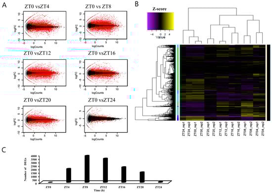 Statistical analysis of differentially expressed genes across samples. MA plots showing pairwise comparisons of transcript levels across samples. ZT0, 4, 8, 12, 16, 20, and 24 indicate time points after the light-on time. Y-axis: log2 fold change (logFC) between the two samples; X-axis: log2 average count normalized to the size factor. Red dots: transcripts with a logFC significantly higher than 2 or lower than −2; black dots: transcripts with a logFC of −2 to 2 (A). Clustered heatmap showing the Pearson correlation matrix for pairwise sample comparisons. The color key was adjusted based on the log2-centered values for optimal visual detection of differences, and the dendrograms show the distance between samples (B). The number of significantly expressed genes (FDR p <0.05) at each time point versus ZT0 (C).