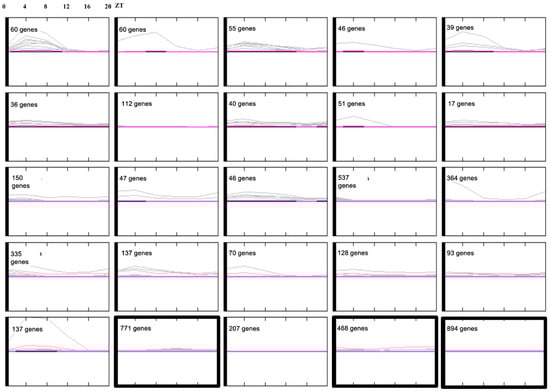 Our results identified 11,699 of 41,019 putative unique transcripts (28.5%) in Chinese cabbage, and 5747 of 22,810 transcripts (25.2%) in Arabidopsis as circadian-regulated. Circadian-related transcripts were 3.3% more abundant in Chinese cabbage compared to Arabidopsis (Tables S3 and S4). Circadian-regulated genes clustered into 25 groups (Table S5). In the B. rapa dataset, transcripts with daytime expression peaks were classified into various groups, and those with nighttime peaks were classified into three groups (Figure 3). The phases of cycling genes were compared between A. thaliana and B. rapa datasets. Under diurnal conditions, most orthologs exhibited similar phases, but some showed an inverse expression (data not shown).