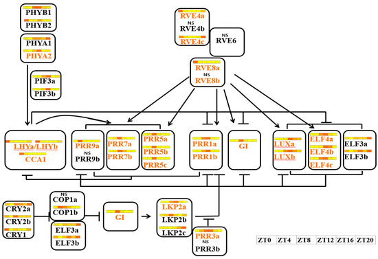 - Rawat, R.; Takahashi, N.; Hsu, P.Y.; Jones, M.A.; Schwartz, J.; Salemi, M.R.; Phinney, B.S.; Harmer, S.L. REVEILLE8 and PSEUDO-REPONSE REGULATOR5 form a negative feedback loop within the Arabidopsis circadian clock. PLoS Genet. 2011, 7, e1001350. [Google Scholar] [CrossRef] [PubMed]