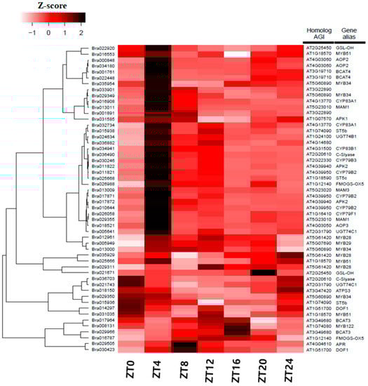 We identified orthologous genes related to the glucosinolate pathway in the B. rapa dataset. Expression of their paralogous genes as a heat map is shown in Figure 7. Though most genes were expressed during the daily cycle—at 4 h after sunrise (ZT4)—genes showed a peak expression. Some MYB TFs were also involved in indolic and aliphatic glucosinolate synthesis. Many Myb transcription factors, except MYB34s, showed peaks at different time points. Most paralogous members showed similar peak time points. Branched-chain aminotransferase (BCAT4) and methylthioalkylmalate synthase (MAM1) involved in the early steps of side chain elongation, and two AOP2 and AOP3 responsible for the side chain modification step in the glucosinolate pathway [] had peak expression at ZT4. We found that three sulpho-transferases (ST) were involved in the core structure of glucosinolate biosynthesis. Among them, one ST5b (Bra015938) and ST5c (Bra025668) showed high expression at ZT4, and the other ST5b (Bra015936) at ZT0. Expression level then gradually decreased during a 24 h period. Similarly, one FMOGS-OX5 (Bra026988) showed peak expression at ZT4 but the other (Bra016787) at ZT16.