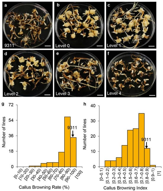 The phenotypes in the introgression lines and the rice cultivar 9311. (a–f) The phenotypes of 9311 and various rice introgression lines (HCLs) ranging from level 0 to 4 based on the scoring system used in our previous study []. Scale bars, 1 cm. (g,h) Frequency distribution of the callus browning rate (CBR) and callus browning index (CBI) in the HCLs. The values for 9311 are indicated by black arrows.