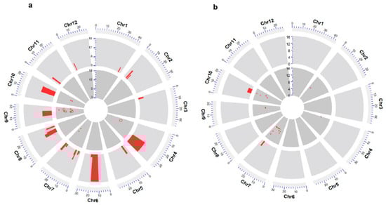 QTL distributions of CBR (a) and CBI (b). The first layer is the result of interval mapping, and the second layer is the result of single-point mapping. Each red box represents a QTL; the width of the red box represents the interval of the QTL, and the height represents the LOD value. The red dot represents the phenotypic variation.
