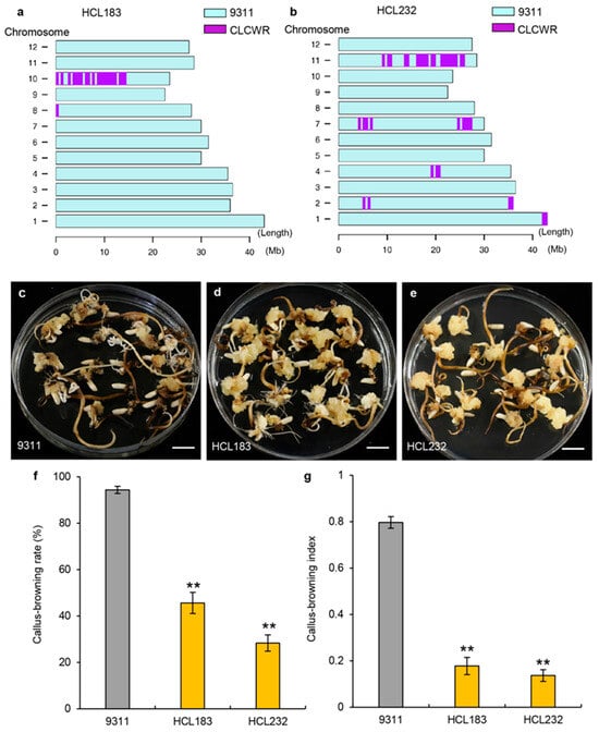 Callus browning phenotypes of introgression lines HCL183 and HCL232 and the recurrent parent 9311. (a,b) Genomic location of the introgressed fragments in HCL183 and HCL232. (c–e) Callus browning phenotypes of 9311, HCL183, and HCL232. Scale bars, 1 cm. (f,g) CBR (f) and CBI (g) in 9311, HCL183, and HCL232. The gray columns represent CBR and CBI of 9311 and the yellow columns represent these of HCL183 and HCL232. Data are presented as means ± standard deviation (SD, n = 3). **, p < 0.01; significant difference determined by the Student’s t-test.