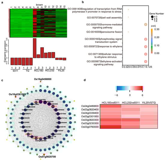 To identify candidate genes associated with callus browning, we screened two introgression lines, HCL183 and HCL232, with light-browning phenotypes. HCL183 carried introgressed fragments from CLCWR on chromosome 10 (Figure 3a), while HCL232 harbored introgressed fragments from CLCWR on chromosome 7 (Figure 3b). The CBR and CBI values of HCL183 and HCL232 were significantly lower than those of 9311 (Figure 3c–g). We performed RNA-seq analysis of calli from 9311, HCL183, and HCL232 that had been induced on a callus-induction medium in the dark for 30 days. We identified differentially expressed genes (DEGs) between 9311 and either HCL. We also downloaded the list of DEGs between the indica cultivar TQ with high callus browning and the introgression line YIL25 with low callus browning, derived from a cross between the Yuanjiang common wild rice (O. rufipogon accession, YJCWR) with light callus browning and TQ from our previous publication [] (Figure S1a–c). Compared to TQ, the CBR and CBI were lower in YIL25 (Figure S1d,e). Combining the DEGs between YIL25 and TQ and those identified between HCL183 and 9311 or HCL232 and 9311, we identified a total of 427 DEGs, including 149 upregulated and 278 downregulated ones. The 427 DEGs were classified into different coexpression modules. Module eigengenes were used to calculate the correlation coefficient with the CBI. The results indicated that deeper color represented a higher correlation (Figure S2a,b). WGCNA divided these 427 DEGs into three modules whose overall expression levels were also highly correlated with the CBI phenotypic data (Figure S2a,b). We confirmed the brown module to be a core module as the overall expression level of this module was highly and negatively correlated with the browning phenotypes (Figure 4a). Through gene enrichment and functional annotation analysis, we found that the genes in the brown module were enriched in pathways such as ‘ethylene-activated signaling’, ‘phytohormone-mediated signaling’, ‘cell wall assembly’, and ‘peroxisome’ (Figure 4b). K-within represents the connectivity of each gene within a single module to all other genes within the same module. A higher value of k-within indicates a higher level of connectivity for the gene, making it more likely to be the core gene of the module. We then sorted the genes in the brown module based on their k-within values and selected the top 20% hub genes. Network visualization of the hub genes was performed using the Omicshare platform (Om-icshare, http://www.omicshare.com/tools/, accessed on 29 August 2023) (Figure 4c). We identified several hub genes that may be related to the differences in callus browning phenotypes between the five materials used. For example, BOC1, which we had previously cloned, decreases callus browning by lowering oxidative-stress-induced cell senescence and cell death []; the transcription factor gene OsEREBP2 is involved in salt stress in rice and may be essential in regulating responses to different abiotic stresses []; and TFIIIA-type zinc finger gene ZFP182 participates in plant development and abiotic stress by participating in ABA-induced antioxidant defense process []. RICE HIGH SHATTERING 1 (RHS1) is a negative regulator of rice seed shattering that modulates the redox signaling molecule S-nitrosothiol [] and other genes like cytochrome P450 genes (Os03g0760000), PEROXISOME BIOGENESIS FACTOR 11 (PEX11, Os03g0301950), and oxidoreductase (Os04g0339400). We have displayed the expression of these hub genes that may be related to callus browning in the form of a heat map in Figure 4d.