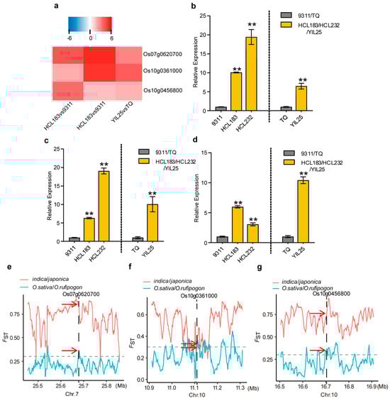 The relative expression and domestication analysis of candidate genes. (a) Heatmap representation of the log2foldchange of the three candidate genes. (b–d) The relative expressions of Os07g0620700, Os10g0361000, and Os10g0456800. All values are means ± SD (n = 3). **, p < 0.01, two-tailed test. (e–g) Fixation index (FST) on chromosomes 7 and 10 between the indica and japonica subspecies O. sativa and O. rufipogon. The position where the black dotted line overlaps with the broken line (the red arrow) is the FST value of the three candidate genes. The dashed gray line represents a critical value of 0.3.