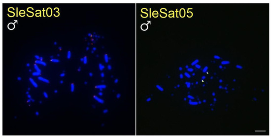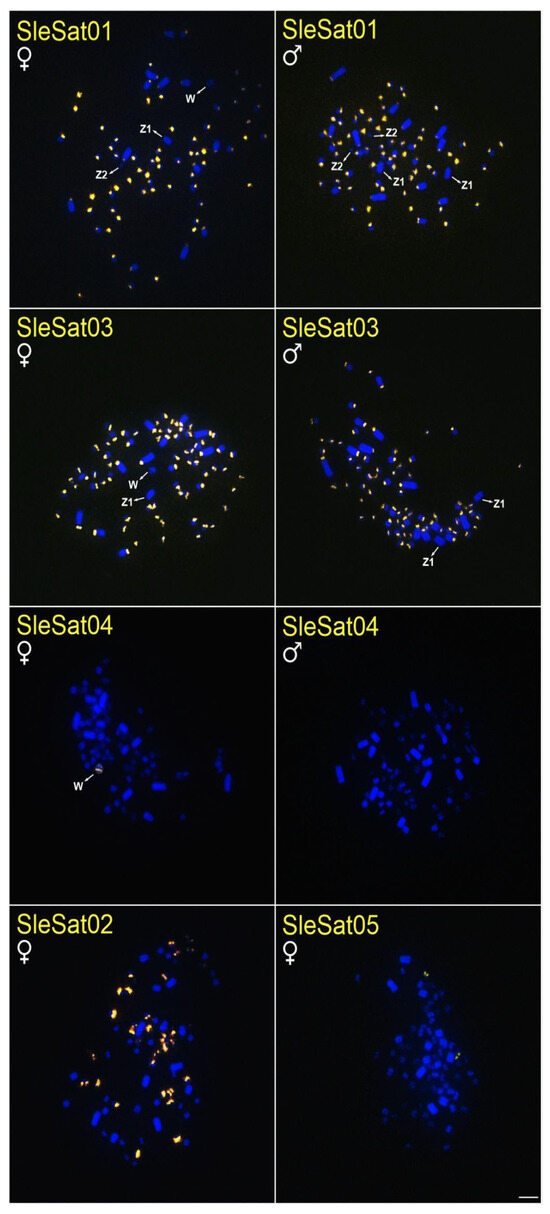 Metaphase plates of females and males of S. dactylatra hybridized with different SleSatDNAs. Bar = 5 µm.