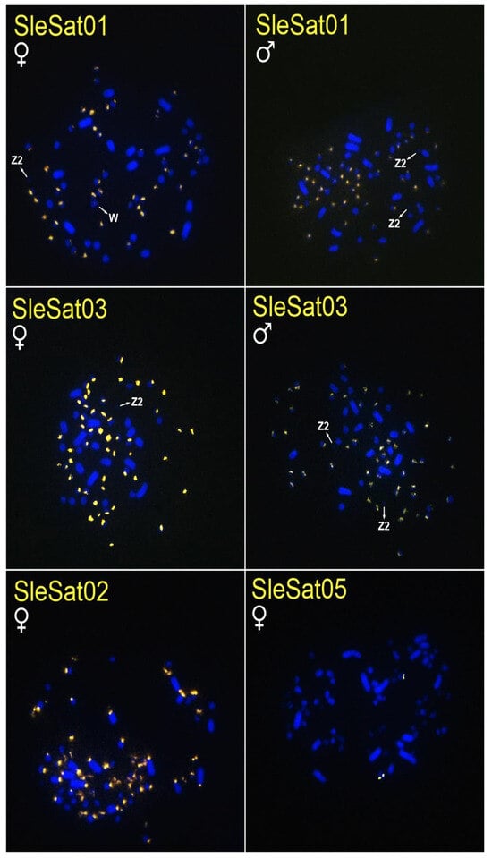SleSat01 probes produced no hybridization signals on the W chromosome of S. leucogaster, whereas weak signals were detected on the W chromosome of S. dactylatra (Table 3, Figure 1). Additionally, SleSat04, which is specific to the female library, exhibited hybridization signals exclusively on the W chromosomes of S. leucogaster (Table 3, Figure 1). Neither SleSat01 nor SleSat03 showed any signals on the Z chromosome; however, SleSat03 was detected on the Z2 chromosome of S. leucogaster (Table 3, Figure 1), and both SatDNAs failed to produce hybridization signals on the Z2 chromosome of S. dactylatra (Table 3, Figure 2).