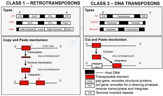 A graphical classification of transposable elements (TEs). The left panel shows Class 1 retrotransposons, and the right panel shows Class 2 DNA transposons. The upper panels show three examples of the genetic structure of each of these two classes of elements. The lower panels show the mode of movement (transposition mechanism) of each class. LTR: Long Terminal Repeats; LINE: Long interspersed nuclear elements; SINE: Short interspersed elements.
