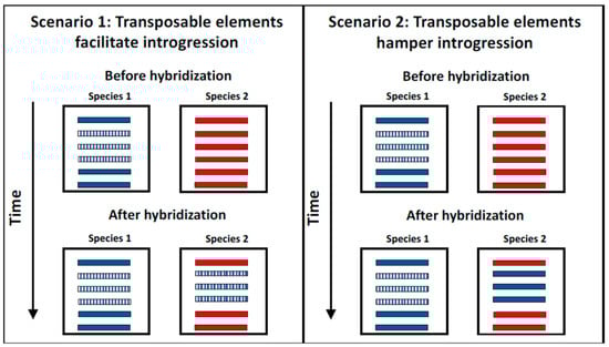 Introgression, which is defined as the transfer of genetic material between species through the production of fertile interspecific hybrids, has recently been shown to be common across all domains of life [,]. Understanding what factors allow for gene exchange is crucial to understanding how species—especially nascent ones—persist in cases where they have the chance to interbreed and fuse into a single lineage. The relationship between transposable elements and introgression is multifaceted and includes (i) TE-aided introgression of non TE-DNA and (ii) interspecific transmission TEs alone.
