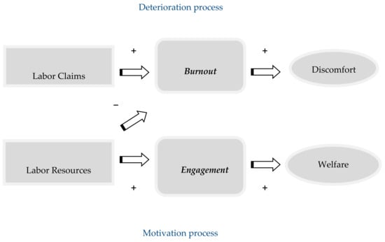 According to [], Figure 1 illustrates the job demands–resources (JD-R) model. At the top, the factors associated with the health deterioration process are presented, while at the bottom, within ellipses, the elements that are part of the motivational process are highlighted. The arrows drawn in the model indicate the direction of the relationships between the different factors of both processes, while the signs reflect the nature of these relationships.