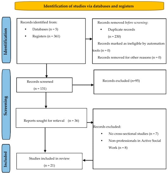 The protocol being followed was registered in the International Prospective Register of Systematic Reviews (PROSPERO) with reference number CRD42024602943 prior to the identification and selection of studies. The search and selection process for the scientific articles that were the subject of this study was carried out between February and September 2024, obtaining a total of 361 records in five databases (Web of Science, Scopus, PubMed, MEDLINE, and PsycInfo). The search terms included the following equation: “Emotional Exhaustion” and “Social Work*”, using the Boolean operator (AND) in each database. No additional filters were applied, and the same search terms were used for articles written in a language other than English.