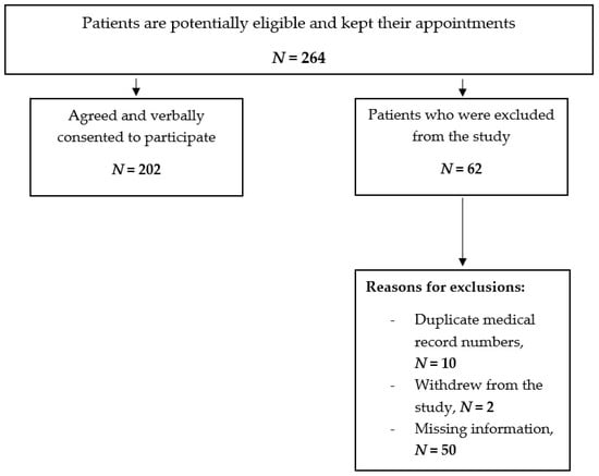 Two-hundred and sixty-four patients who met the inclusion criteria were identified by reviewing their electronic medical records and ensuring that they meet the inclusion criteria. Patients’ health conditions are documented in text under the physicians’ notes. Those patients were selected systematically by selecting every 10th patient from the electronic lists of patients scheduled for regular follow-up appointments with their primary care physicians between October 2018 and March 2021 in E-Sihi database, which is the electronic health system at KKUH. The patients were recruited by three pharmacy interns who were trained to recruit patients by following a standardized protocol specifying every step on how to approach patients, explaining the purpose of the study, and inviting them to participate by asking for their consent prior to inclusion in the study.