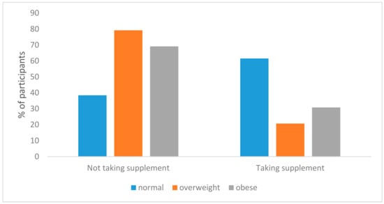 Results of the chi-square test showed that significantly greater proportion of the students who used supplements was in those students with normal BMI (61.5%) (p = 0.016). In a group of participants who took supplement, the percentage of the overweight students was 20.7%, while the percentage of the obese students was 30.9% (Figure 2).