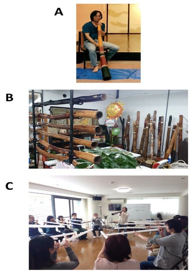 The DHPM classes were performed as described below. Figure 1A shows a didgeridoo being played by one of the authors, T. Kojima. Usually, didgeridoo is played while sitting down on the floor or on a chair. Several types of didgeridoo are introduced in Figure 1B. This instrument is the world’s oldest wooden instrument that Aboriginal natives, with a history of over 4000 years, used in ceremonies dating back to over 1000 years ago [,]. The didgeridoo is a brass instrument. Eucalyptus trees are cut off by termites and used as musical instruments, and each is colored as shown in the figure. It is positioned as any brass instrument to facilitate vibration of the lips and generate sound without using a reed. Additionally, as people become more proficient players, performance includes cyclical breathing—a breathing method that involves breathing in from the nasal cavity and is exhaled from the oral cavity and where there is no interruption in sound due to breathing, which can result in continuation of sound over long times.