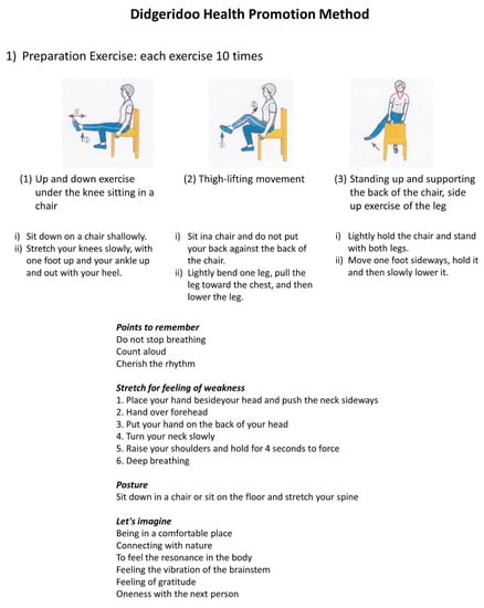 The didgeridoo health method promotion society is also focusing on the training of leaders (Meisters) who will teach the DHPM. The implementation of this health method is also appropriate for lesson groups comprising a few to about twenty people (Figure 1C), and the training of Meisters is also necessary for its continued implementation. Henceforth, in addition to targeting the general healthy public, the DHPM can be implemented by companies and factories as a form of health promotion. Workers in various industries and factory settings have recently been encouraged to engage in physical activities at the gym. Gazmararian et al. evaluated the effectiveness of addressing multiple barriers to physical activity (PA) using interventions at the workplace. Their results showed that there was no significant improvement when a group was involved in gym activity alone compared to the control. However, with education based on physical training in the gym, improvements were sustained for over 9 months []. Partonen et al. reported that supervised physical exercise combined with exposure to bright light appears to be an effective intervention for improving mood and certain aspects of health-related quality of life in the winter time []. Since their report dealt with subjects in Finland, bright lights might be an important factor in domestic circumstances. However, a combination of physical exercise and mental health promotion is certainly better for total health promotion. Additionally, if these workers performed DHPM twice a week, it would enhance their physical as well as their mental health. Another appealing aspect of DHPM concerns the involvement of regional neighborhood associations/communities, where DHPM lessons allow for up to approximately twenty people to participate concurrently. Thus, it is better to begin with small groups in regional communities and then spread to other community groups. These efforts should assist in facilitating health promotion using the didgeridoo.