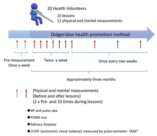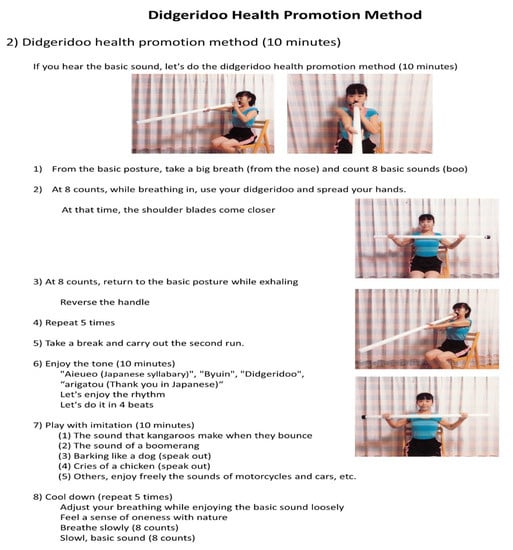 The didgeridoo is an Aboriginal brass instrument that is indigenous to the Australian continent. Although it is wooden, it is classified not as a woodwind instrument but as a brass instrument by the sound generation principle [,]. One of the authors, T. Kojima, has been mastering the traditional wooden brass instrument the didgeridoo since 2000, and has been active as a performer and performance leader. It has been acknowledged that the promotion of abdominal breathing, moderate stimulation of respiratory muscles, and stimulation such as overtones and vibration of sounds associated with didgeridoo performance may lead to health promotion. Additionally, in 2014, the Didgeridoo Health Method Promotion Society (DHMPS) was established, along with development of the didgeridoo health promotion method (DHPM), which includes a trainer of the DHPM referred to as a Meister, has been deployed nationwide in Japan.