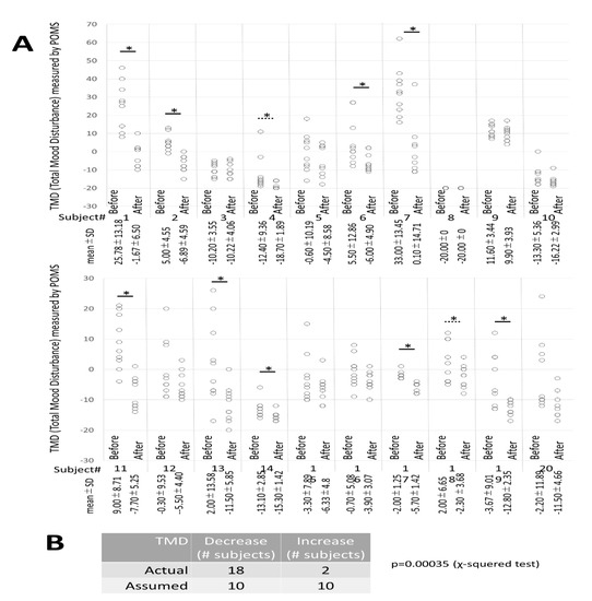 TMD from POMS2 Questionnaire. (A) The mean ± standard deviation of TMD before and after 10 lessons of the 20 individual subjects is shown. Eight out of twenty subjects showed significantly lower values after the lesson compared with values before the lesson. Two subjects showed a decreasing tendency (0.1 > p > 0.05). (B) A comparison was not made between groups before and after the lesson, but the number of people whose values after and before or after before and after were compared. Assuming that the predicted value would decrease or rise by half, the results indicated a decrease in 18 subjects and a rise in 2 subjects. In the chi-squared test, there were many subjects who dropped significantly (p = 0.00035).