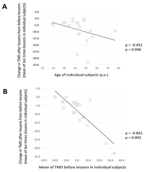The relationship between the change before and after a lesson (post-value minus pre-value) of the TMD (measured before and after 10 lessons in 20 subjects) is shown in Figure 6. The relationship between the age (Figure 6A) and the average value of the TMD before the lesson is also shown (Figure 6B). All showed a significant inverse correlation.
