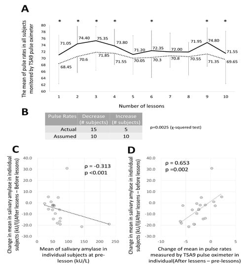 Pulse changes in subjects before and after lessons and changes in salivary amylase levels that serve as stress indicators. (A) Changes in pulse rate as measured by TAS9VIEW®. The horizontal axis shows the first to the tenth lesson. The solid line shows the average pulse rate of the 20 subjects before each lesson. The dotted line represents the average value after the lesson. The pulse rate decreased significantly, except at the fifth, seventh, and eighth lessons. (B) The average pulse rate for all of the 10 lessons of the 20 subjects: the pulse rate declined in 15 subjects and rose in 5 subjects. The chi-squared test was performed with each half as a predicted value. There were many subjects whose value decreased significantly. (C) For salivary amylase, the horizontal axis shows the average value before each lesson of the 20 subjects, and the vertical axis shows the change in the average values (post-value minus pre-value) before and after the lessons of these subjects. This shows a significant inverse correlation. (D) Horizontal axis: change in pulse rate value of the 20 subjects as measured by TAS9VIEW® (post-value minus pre-value); vertical axis: change in salivary amylase value before and after lessons of the subjects (post-value minus pre-value). This shows a significant positive correlation.
