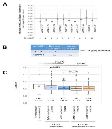 Additionally, the aforementioned analyses were performed for the entire group of 10 lessons or all 20 subjects, with the initial (intense) period of the DHPM in the 10-week course comprising two lessons a week (3 weeks, 6 lessons) and the final (more relaxed) period comprising lessons once every two weeks (8 weeks, 4 lessons). This implementation of intense and more relaxed lesson periods was designed to determine whether the effects on the autonomic nervous system caused by the DHPM were sustainable, as determined by Ln[LF/HF].