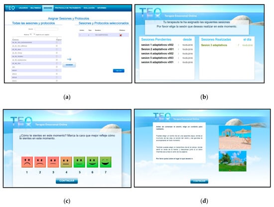 Another benefit of using the Internet to deliver interventions is greater dissemination, reaching different target groups []. Particularly, a flexible tool like the TEO system can be used in a blended mode, complementing therapy, or in a tele-assistance mode as self-administered therapy. It increases the intervention possibilities, making it more accessible for all the potential users. Enhancing the accessibility of psychological treatments is one of the main challenges in general mental health [,,]. In addition, the TEO system offers great adaptability and flexibility in adjusting the therapeutic homework to each patient’s characteristics and needs. In other computerized treatment programs, the therapeutic sessions are closed and the same for all users. However, this tool allows clinicians to configure personalized therapeutic sessions (which are modifiable) that can potentially be useful for any emotional disorder. Finally, this web-based system allows patients to practice at home what they have worked on during the therapy sessions in a self-applied way. In this way, they not only receive treatment in the consultation room, but also in the period between sessions, providing the patient with a more active role and more involvement in the whole treatment process, as well as immediate and continuous feedback about the fulfillment of the homework, which can increase the patient’s motivation to keep practicing.