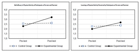 As presented in Figure 1, the experimental group had significant increases in attitudes toward PA from pre-test to post-test for self-efficacy and learning when compared to the control group. Although to a smaller extent, the same was observed for benefits and importance of PA.