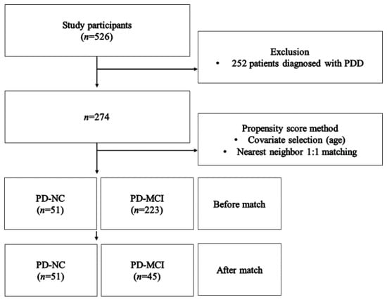 Observational studies frequently utilize secondary data and these studies are more likely to experience data imbalance while comparing patients and healthy subjects []. Propensity score matching (PSM) was used to minimize selection bias and resolve the imbalance of case-control []. This study found an imbalance between PD-NC and PD-MCI. In order to solve this issue, this study used PSM, balancing between populations using the nearest neighbor matching by controlling the age of the case-control group []. Moreover, this study excluded individuals (subjects) that did not match in both groups in common to ensure good data balance. Before matching, there were 274 subjects (PD-MCI = 223; PD-NC = 51), and, after conducting PSM, it was matched to 96 subjects (PD-MCI = 45, PD-NC = 51; Figure 1). This study finally analyzed 96 subjects.