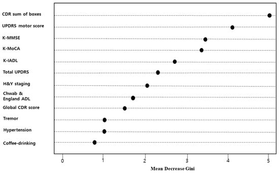 Several previous studies [,,] have reported on Parkinson’s dementia predictors using biomarkers such as cerebrospinal fluid (CSF) and electroencephalogram (EEG) data. However, we are unaware of any study that identifies the predictors of PD-MCI for patients with PD and normal cognition (PD-NC), taking into account sociodemographic factors, lifestyles, depression, and neuropsychological characteristics. The objectives of this study were to develop a random forest-based PD-MCI prediction model considering health behaviors, environmental factors, medical history, physical functions, depression, and cognitive functions by using the Parkinson’s Dementia Clinical Epidemiology Data (a national survey conducted by the Korea Centers for Disease Control and Prevention), and to compare its prediction of accuracy with those of decision tree and multiple logistic regression models.