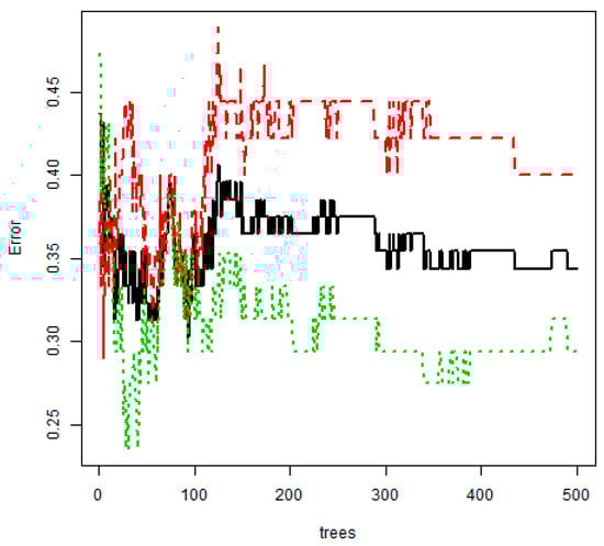 Out-of-bag error rate curve (random forest model). Black line—overall accuracy; red line—sensitivity; Green line—specificity.