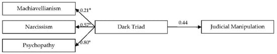 Dark triad as a predictor of judicial manipulation SEM model in Study 1. * p < 0.01. χ2(2) = 1.46, p = 0.48, RMSEA = 0.001 (90% CI: 0.001–0.055), NFI = 0.99, CFI = 0.99).