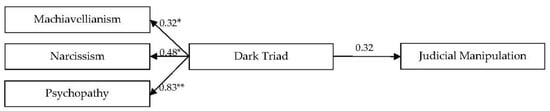 Dark triad as a predictor of judicial manipulation SEM model in Study 2. *p < 0.01, ** p < 0.001. χ2(2) = 0.32, p = 0.98, RMSEA = 0.001 (90% CI: 0.001–0.001), NFI = 0.99, CFI = 0.99).