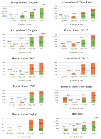 Our observations regarding the percentage distribution between shares and news were particularly interesting (Table 3). In 6 out of 9 search topics (“vitamina C”, “vitamina D”, “aglio”, “5G”, “laboratorio”, “HIV”), the percentage of shares for fake articles was greater than that of verified new articles. For example, regarding the keyword “HIV”, the percentage of fake regarding was 11.1% (therefore, the percentage of real news was 88.9%). This ratio is not mirrored when observing the percentages of shares for both fake and real news. Shares of “fake news” accounted for 77.8%, while shares of real news accounted for 22.2%. This means that on average, “fake news”—standardized for the same number of total news results—seems to have a higher number of shares when compared to real news; that is, a much higher likelihood of being shared and known.