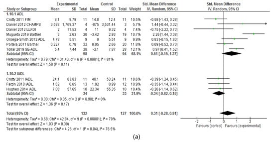 The studies which assessed the overall performance of ADLs (I2 = 79%) and transfers (I2 = 77%; chi-squared p = 0.0007) showed a high heterogeneity. In the studies which analyzed functional ambulation, heterogeneity was moderate, with I2 = 55% (chi-squared p = 0.004). The forest plots (Figure 2a,b) show a significant variability between the studies which favored the experimental intervention.