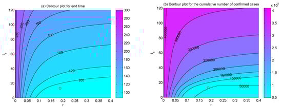 Contour plots of (a) the end time, (b) the final number of confirmed cases, (c) the final number of deaths, and (d) the final number of recovered cases with respect to r and . The circles represent the positions of we have estimated.