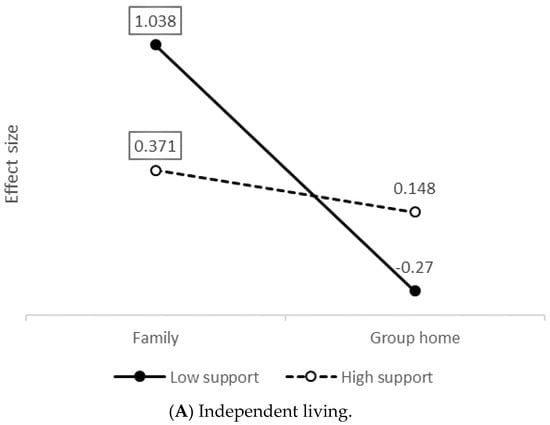Figure 3A–C shows the differences in latent mean between living environments, separately for extensive and low support needs. Each point on the graph represents the standardized mean difference (analogous to Cohen’s d) between those living in a nursing home (group that is being used as baseline level and its mean is set to zero) and the other two groups (family and group home) on each variable of interest, taking also into account the degree of support required (high support needs or low support needs). Differences that are significantly different from zero (p > 0.05) are provided inside a rectangle.